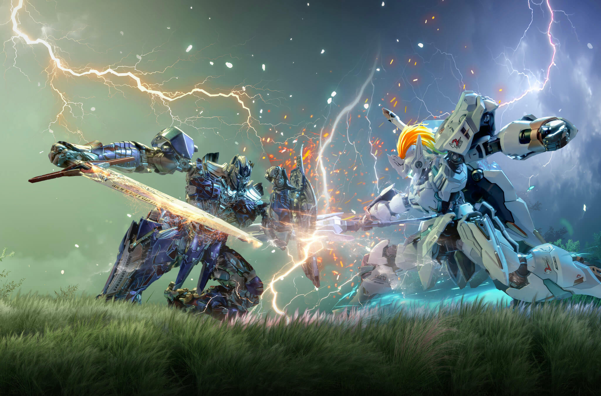 The photograph features two classic knight miniatures, the Knight Pillar and the Knight in the Lake. Shot from a wide-angle perspective with vegetation in the foreground and a two-tone gradient background, the scene presents the figures in dynamic poses, highlighting the colors, textures, and craftsmanship of the physical models.