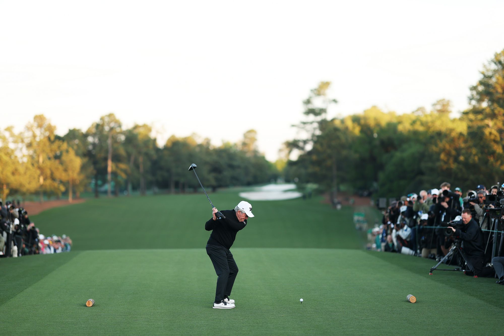 It was only in 1963 that this Masters tradition began, and it is only relatively recently that it was past champions given the honour, but three golfing greats have officially got proceedings underway with the ceremonial tee shot. Jack Nicklaus, Gary Player and Tom Watson have belted (or, at least, caressed elegantly) their ball in the direction of the first fairway – we are up and underway.
