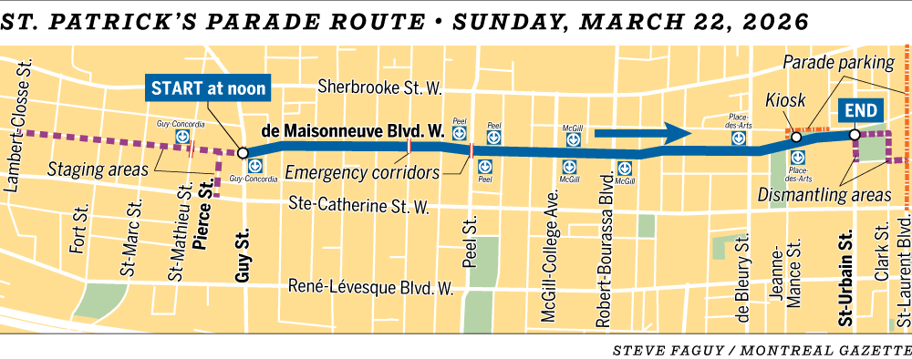will close de Maisonneuve Blvd. between St-Marc St. and St-Laurent Blvd. from 8 a.m. Sunday until after the parade completes in the afternoon. Neighbouring streets will also be used for staging, teardown and parking.